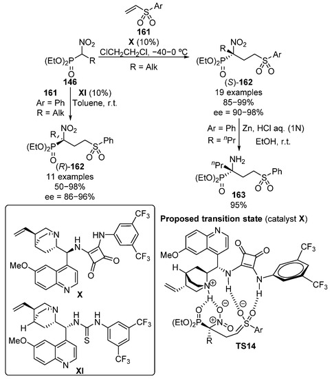 - Bera, K.; Namboothiri, I.N.N. Enantioselective synthesis of α-amino-γ-sulfonyl phosphonates with a tetrasubstituted chiral α-carbon via quinine-squaramide-catalyzed michael addition of nitrophosphonates to vinyl sulfones. Adv. Synth. Catal. 2013, 355, 1265–1270. [Google Scholar] [CrossRef]