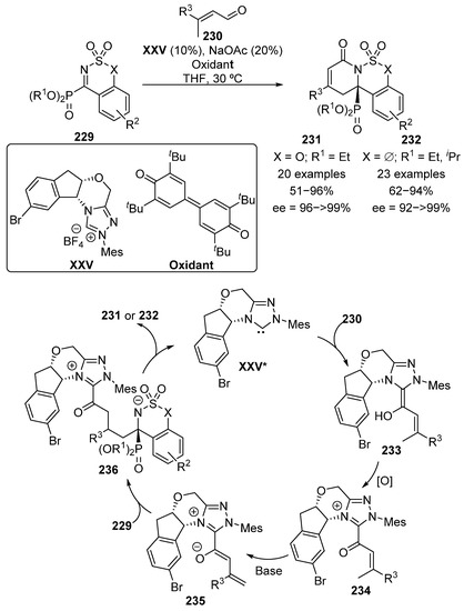 - Sun, J.; Mou, C.; Liu, C.; Huang, R.; Zhang, S.; Zheng, P.; Chi, Y.R. Enantioselective access to multi-cyclic α-amino phosphonates: Via carbene-catalyzed cycloaddition reactions between enals and six-membered cyclic imines. Org. Chem. Front. 2018, 5, 2992–2996. [Google Scholar] [CrossRef]