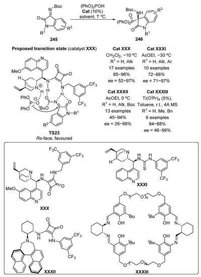 - George, J.; Sridhar, B.; Reddy, B.V.S. First example of quinine-squaramide catalyzed enantioselective addition of diphenyl phosphite to ketimines derived from isatins. Org. Biomol. Chem. 2014, 12, 1595–1602. [Google Scholar] [CrossRef]