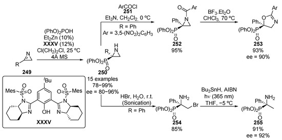- Nakamura, S.; Hayama, D. Enantioselective Reaction of 2H-Azirines with Phosphite Using Chiral Bis(imidazoline)/Zinc(II) Catalysts. Angew. Chem. Int. Ed. 2017, 56, 8785–8789. [Google Scholar] [CrossRef] [PubMed]