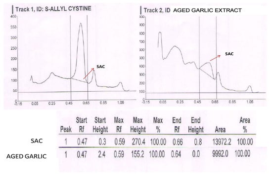 The “aging method” extracts AGE from garlic cloves after an extensive extraction process. The aging causes complete hydrolysis of g-glutamyl cysteines to S-allyl cysteine (SAC) and S-1-propenyl cysteine. Additionally, it results in an increase in cysteine (due to protein hydrolysis) and S-allyl mercapto cysteine [34,35]. Further, we used a standard chromatographic technique [36], high-performance thin-layer chromatography (HPTLC), to identify and quantify SAC in AGE.