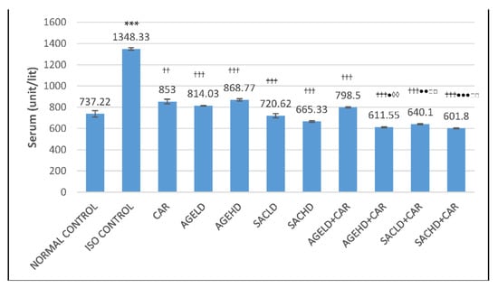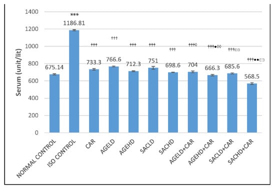 Effect on serum LDH activities. The data are given as mean ± SEM; *** p < 0.001 compared with normal control; †† p < 0.01, ††† p < 0.001 in comparison with ISO control; ● p < 0.05, ●● p < 0.01, ●●● p < 0.001 in comparison with carvedilol; ◊◊ p < 0.01, when compared with respective AGE dose; □□ p < 0.01 when compared with respective SAC dose; ISO (isoproterenol, 150 mg/kg); CAR (carvedilol 10 mg/kg); AGELD (aged garlic extract low dose 2 mL/kg); AGEHD (aged garlic extract high dose 5 mL/kg); SACLD (S-allyl cysteine low dose 13.1 mg/kg); SACHD (S-allyl cysteine high dose 32.76 mg/kg).
