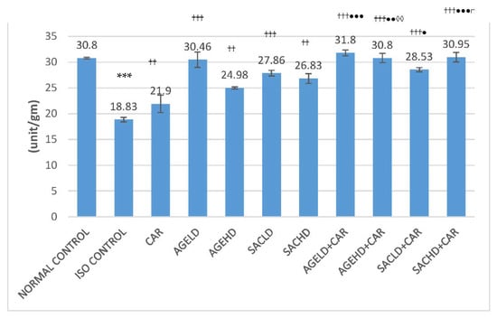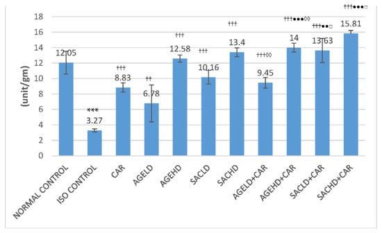 Effect on catalase activities. The data are given as mean ± SEM; *** p < 0.001 compared with normal control; † p < 0.05, †† p < 0.01, ††† p < 0.001 in comparison with ISO control; ● p < 0.05, ●● p < 0.01, ●●● p < 0.001 in comparison with carvedilol; ◊◊ p < 0.01, ◊◊◊ p < 0.001 when compared with respective AGE dose; □□ p < 0.01 when compared with respective SAC dose.