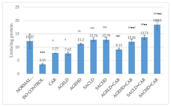 Effect on superoxide dismutase activities. The data are given as mean ± SEM; *** p < 0.001 compared with normal control; † p < 0.05, †† p < 0.01, ††† p < 0.001 in comparison with ISO control; ● p < 0.05, ●● p < 0.01 in comparison with carvedilol; ◊ p < 0.05 when compared with respective AGE dose; □ p < 0.05 when compared with respective SAC dose.