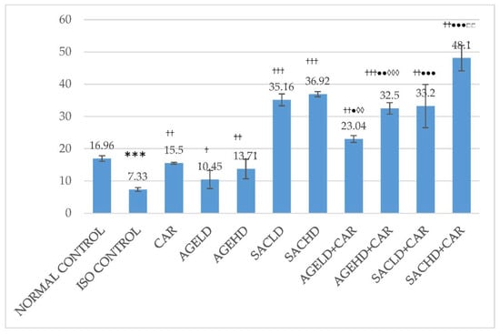 Two days of injection of ISO resulted in a reduction in SOD and catalase activities in HTH. ISO administration produced a significant reduction in the SOD and catalase activities in comparison with normal control. Further, all treated groups displayed a significant rise in these enzyme activities compared with ISO control. Significantly increased activities were observed in groups that received AGE and SAC along with CAR when compared with groups that received only CAR (Figure 6 and Figure 7). AGE low and high doses with CAR showed significantly better activities of SOD and catalase when compared with groups that received AGE and SAC, respectively.