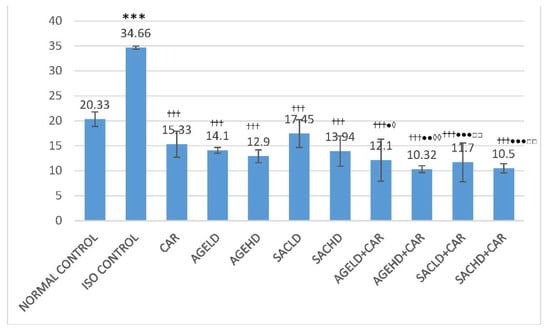 Effect on thiobarbituric acid reactive species. The data are given as mean ± SEM; *** p < 0.001 compared with normal control; ††† p < 0.001 in comparison with ISO control; ● p < 0.05, ●● p < 0.01, ●● p < 0.001 in comparison with carvedilol; ◊ p < 0.05, ◊◊ p < 0.01 when compared with respective AGE dose; □□ p < 0.01 when compared with respective SAC dose.