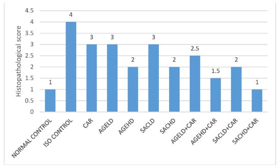 The vehicle-treated group, the AGEHD + CAR group, and the SACHD + CAR group all had minimal necrosis (Figure 9). The ISO group had severe necrosis, inflammation, and fibrosis. The CAR and AGELD treatment groups had moderately diffused necrosis, slight inflammation, and fibrosis. In the AGEHD, SACHD, AGELD + CAR, AGEHD + CAR, and SACLD + CAR groups, mild diffuse necrosis, moderate necrosis, and mild inflammation were observed (Figure 10).