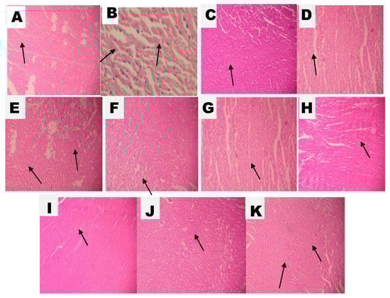 Hematoxylin and eosin (H&E) stained section of hearts of different study groups. Photographed at magnification 400×. (A) Normal control group shows normal myocardial structure with intact cell membrane without necrosis, (B) ISO control shows vacuolar change and necrosis with focal cell infiltration with inflammatory patches, (C) carvedilol-treated groups (10 mg/kg) with intact architecture, (D) AGE low-dose-treated group (2 mL/kg) with slight increase in the intercellular space and decrease in the size of the cardiocytes in some areas, (E) AGE high dose (5 mL/kg) with some areas showing haphazardly arranged cardiocytes, (F) SAC low dose (13.1 mg/kg) shows patchy areas of mild necrosis, (G) SAC high dose (32.76 mg/kg) shows mild decreased size of some cardiocytes, (H) AGE low dose + CAR shows moderately diffused necrosis, (I) AGE high dose + CAR, (J) SAC low dose + CAR with moderately diffused necrosis and inflammatory patches, and (K) SAC high dose + CAR shows almost normal cardiac musculature.