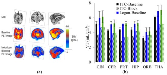 Our continued efforts in radiolabeling arylsulfone-based coxibs resulted in the identification and radiolabeling of a coxib known as TMI with superior affinity and selectivity to COX-2 (IC50 = < 1 nM; entry 7, Table 1) [57,58,59]. We reported the synthesis, radiosynthesis and in vivo PET studies of [11C]TMI in nonhuman primates [58]. PET imaging in normal baboons was performed after the intravenous (i.v.) administration of [11C]TMI, which showed BBB penetration and a heterogeneous brain uptake and retention pattern (Figure 2). Moreover, the baseline binding was blocked using meloxicam, which indicates specific binding to COX-2 in the brain. [11C]TMI exhibits uptake even to constitutive COX-2 expression in the brain, which makes it a potential candidate for in vivo PET studies of COX-2 upregulation in neuroinflammation. Further experiments in animal disease models, as well as the evaluation of kinetic parameters, are needed to further the translation of [11C]TMI for clinical studies of neurological disorders associated with COX-2 induction.