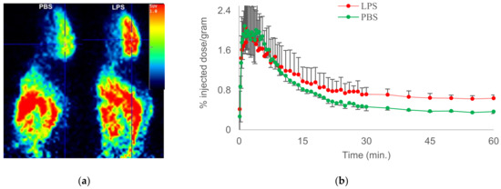 Representative microPET images of [18F]MTP in PBS- and LPS-administered mice (a); TACs of [18F]MTP in PBS- (green) and LPS (red)-treated mice (b).