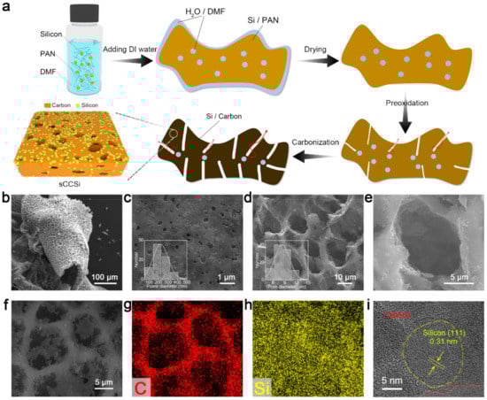 The synthesis process of sCCSi is illustrated in Figure 1a. Silicon nanoparticles and polyacrylonitrile (PAN) are mixed in N, N-Dimethylacetamide (DMF) solution as precursor solution. De-ionized water (DI water) is then added to the precursor solution, which causes the exchange of two solutes (DMF and DI water). Afterwards, PAN is precipitated out due to the limited solubility in DI water [12,13,14]. At the same time, silicon nanoparticles are uniformly coated by PAN to form the PAN-coated silicon (Si/PAN) precursor. The process of precipitation is shown in Figure S1. Notably, the surface and interior of the Si/PAN precursor inevitably contain some water or DMF during the gradual precipitation process. In the following drying process, the water on the surface of the precursor evaporates to form a rough surface. In the further pre-oxidation process at 280 °C with a heating rate of 1 °C min−1, the high temperature is enough to evaporate the water or DMF inside the precursor, which will create many pores forming a sponge-like porous structure. Finally, sCCSi is obtained after carbonization. Compared with other methods for the synthesis of silicon-based anodes [8,15,16,17,18,19,20,21,22,23], our synthesis method is easier, as shown in Table S1. The structural characterization of sCCSi is shown in Figure 1b–i. Figure 1b clearly shows the sCCSi is with a sponge-like porous structure. Moreover, the pore diameter is observed over a large range from hundreds to thousands of nanometers. Two typical porous structures with small pores and large pores are shown in Figure 1c,d, and the mean diameters are 191 nm and 8.3 μm, respectively. The detailed statistical distribution and statistical data of the typical pore diameter are shown in the insets of Figure 1c,d and in Table S2. An enlarged view of a large sponge-like pore is shown in Figure 1e, where a rough inner wall is observed. The sponge-like carbon skeleton of sCCSi is further revealed from Figure 1f and its corresponding EDS mapping of carbon element (Figure 1g). In addition, the EDS mapping of the silicon element (Figure 1h) indicates that the silicon nanoparticles are relatively uniformly distributed. Furthermore, a typical coating microstructure is shown in the high-resolution TEM image (Figure 1i), in which the crystalline silicon nanoparticle with a lattice spacing of 0.31 nm is encapsulated by the amorphous carbon phase.