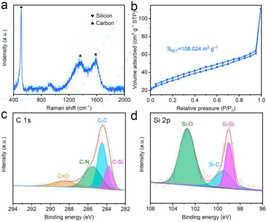 Structural and compositional characterization of sCCSi. (a) Raman spectrum of sCCSi. (b) Nitrogen isothermal adsorption–desorption curve of sCCSi. High-resolution X-ray photoelectron spectrum (XPS) spectrum of (c) C 1s and (d) Si 2p of sCCSi.