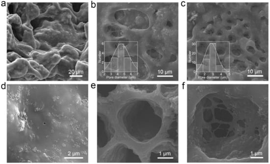 The impact of the stirring temperature and oscillation method on sponge-like porous structure. SEM images of the morphologies and structures of the CCSi obtained through three different processing methods: (a,d) CCSi-HT-U, (b,e) CCSi-HT-M, and (c,f) CCSi-RT-U. The insets in (b,c) are the statistical distribution of corresponding pore diameters.