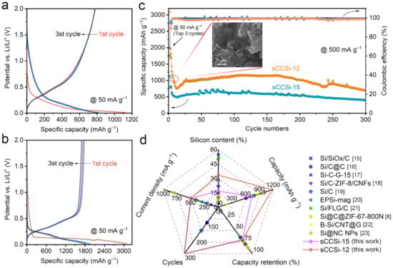 To investigate the cycling stability of the sCCSi, the half-cells are assembled using two sCCSi materials with the normal and excessive silicon-to-carbon ratios of 1:5 and 1:2, which are denoted as sCCSi-15 and sCCSi-12, respectively. Figure 5a,b show the top three cycles’ charging/discharging profiles at 50 mA g−1 of sCCSi-15 and sCCSi-12, respectively. In the first cycle, sCCSi-15 and sCCSi-12 exhibit the capacities of 3084.1 mAh g−1 and 1131.9 mAh g−1, respectively. The larger specific capacity of sCCSi-12 can be attributed to the higher silicon-to-carbon ratio. However, the initial coulombic efficiency of sCCSi-15 (68.5%) is higher than that of sCCSi-12 (57.6%). Moreover, in the next two cycles, the coulombic efficiency of sCCSi-15 is about 96%, while that of sCCSi-12 is only about 90%. It can be attributed to the more exposed new surface of sCCSi-12 caused by the serious material fragmentation, which thus consumes more electrolyte to form SEI film [36,37]. The cycling stability of sCCSi is further revealed, as shown in Figure 5c. In the early stage of the cycling test, a rapid specific capacity decline of sCCSi-12 is observed. As shown in the inset in Figure 5c, the silicon nanoparticles fill the porous structure as well as the surface of sCCSi-12. This kind of structure can increase the shedding pulverization risk of sCCSi, which will cause rapid irreversible capacity loss. The specific capacities remained relatively stable after about 30 cycles. The highest discharging specific capacities of sCCSi-12 and sCCSi-15 are up to 1173.1 mAh g−1 and 726.7 mAh g−1 in the following cycles. Furthermore, sCCSi-15 shows an excellent capacity retention of 70.6% after 300 cycles. Moreover, sCCSi-12 also maintains excellent cycling stability, with 70.2% capacity retention after 300 cycles. Notably, the capacity fluctuation during cycling is related to the SEI film [38]. These results indicate sCCSi has excellent capacity stability, proving the validity of sponge-like porous structure design. Considering the facile synthesis process and flexible regulation of the porous structure, the excellent capacity stability of sCCSi is highly competitive with those reported for lithium-ion batteries [8,15,16,17,18,19,20,21,22,23], as shown in Figure 5d and Table S3.
