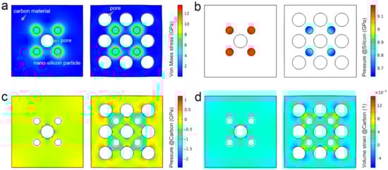 To reveal the mechanical mechanism of sponge-like porous structure on structural stability, two 270 nm × 270 nm two-dimensional models of CCSi and sCCSi were built. The CCSi model contained one 50 nm pore in the center and four 25 nm silicon particles. The sCCSi model contained nine 50 nm pores and four 25 nm silicon particles. In each model, the center pore was set to be the fixed boundary. The expansion during lithiation was simulated by thermal expansion [42,43], the thermal stress ε can be given by: