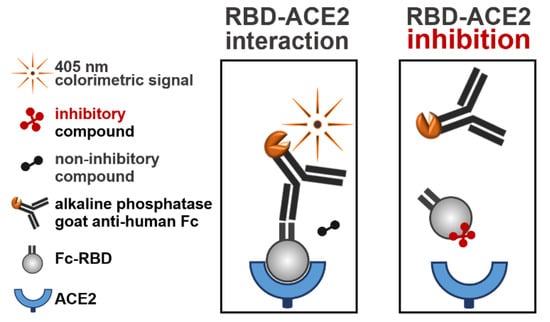 Schematic illustration of the RBD-ACE2 binding assay. Ninety-six-well plates were coated with ACE2 (100 ng/well) and blocked with TSTA buffer. Each compound (10 µM) from the libraries was incubated with Fc-RBD (1 µg/mL) for 1 h at 25 °C. Following incubation, mixtures were added to the ACE2-coated plates and incubated for 1 h at 37 °C. After washing, the plates were incubated for 1 h at 37 °C with the alkaline phosphatase-conjugated goat anti-human Fc fragment. The plates were then washed, and a colorimetric reaction was developed by the addition of pNPP (measured at 405 nm). Left panel: a maximum signal of an uninterrupted RBD-ACE2 interaction was obtained in the presence of noninhibitory compounds. Right panel: a reduced signal of an inhibited RBD-ACE2 interaction was obtained in the presence of inhibitory compounds.