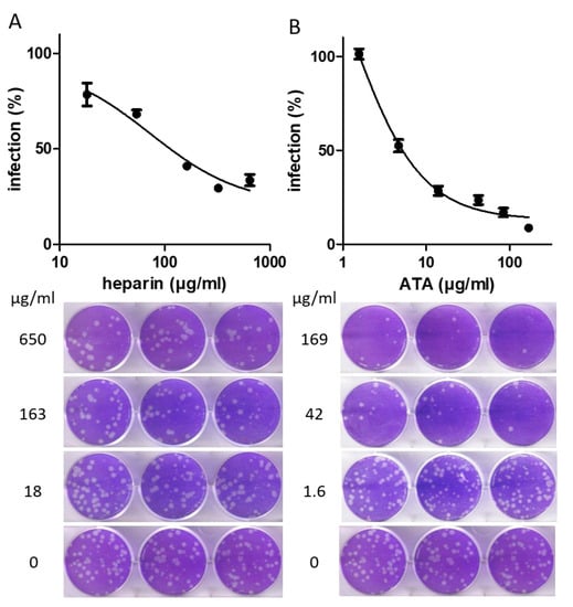 The three hit compounds were further characterized for their ability to inhibit the infection of Vero E6 cells by a pseudotyped virus expressing the SARS-CoV-2 spike protein using a plaque reduction assay. Only ATA and heparin sodium preserved their inhibitory activity in the cellular system. The IC50 values obtained in the cellular assay were an order of magnitude higher than those obtained in the binding assay, and in both assays, ATA demonstrated a higher inhibitory potency. Of note, the IC50 value obtained herein for heparin sodium is in line with that described in a recent report for the inhibition of the SARS-CoV-2 virus [34].