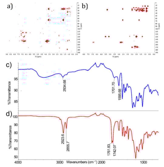 (a) HMBC spectrum of Kraft lignin, (b) HMBC spectrum of lignin FAEL, (c) FT-IR spectrum of Kraft lignin, and (d) FT-IR spectrum of FAEL.