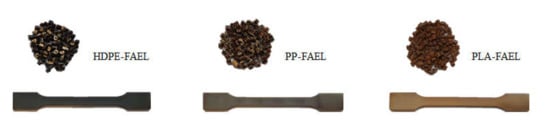 Polymer blends of FAEL in PP, HDPE, and PLA were prepared using a Coperion twin-screw compounder to mix blends with a 20% FAEL to plastic proportion and pure samples of PP, HDPE, and PLA as reference material at 180 °C. The obtained extrudates were cut using a granulator into pieces followed by injection molding of the pellets into dumbbell-shaped samples using an Engel injection molder at 185 °C with reference to ISO 527-2 specifications. The dumbbell samples were used to determine the tensile properties of each FAEL sample compared to the reference, respectively.