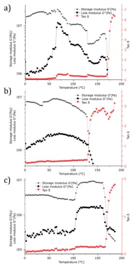 Using rheology as a tool for characterization, the various blends were studied using temperature ramps up to 185 °C to cover all phase changes as confirmed using the DSC measurements (Figure 6) to investigate the mechanical behavior and blend morphology as a function of time upon heating. As seen in Figure 6a, the PLA blend shows a substantial shift in loss modulus upon reaching 49 °C for which the DSC measurements of the same sample suggest an occurrence of Tg. Temperature range 75–96 °C show a steep decrease in G’, a clear sign of the crystallization phase in the blend which further is confirmed by the DSC measurement. A recrystallization phase is spotted at 133 °C before the material completely melt at 173 °C. Commonly, one issue using PLA is its low-rate crystallization and even though the comparison with pure PLA to establish any improvements in crystallization rate is included in this study, it would be a factor of interest for further research. Figure 6b suggests that the HDPE blend show a relatively stable structure with small molecular rearrangements up to 65 °C, and a complete melt of the blend at 135 °C. The PP blend morphology is relatively stable up to 100 °C, as seen in Figure 6c before the stiffness increase with a large margin. By comparing Figure 3 at temperature range 100–130 °C in the cooling cycle and Figure 6c, a sufficiently slow temperature ramp is applied to enable crystallization rather than melting.