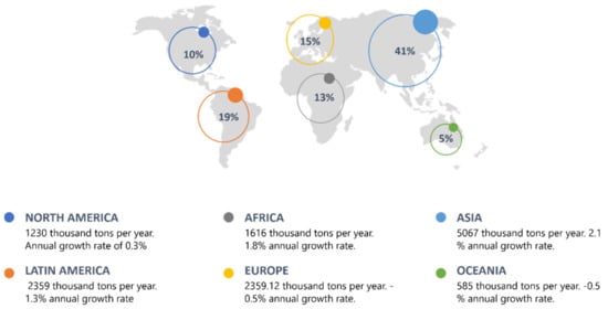 Currently, there are various industrial processes that contribute to the deterioration of water quality; most require the use of highly polluting substances for terrestrial and aquatic ecosystems; therefore, it is imperative to apply a treatment before its discharge in different water bodies. The tanning sector allows the transformation of degradable animal leather into non-degradable leather by eliminating impurities and unnecessary materials [1]; however, this process generates different residues that represent a significant environmental problem, requiring specific treatments, which are expensive and inaccessible in many developing countries. [2]. In the global context, Asia together with Latin America and Europe are the main leather producers in the world [3,4] (Figure 1). It is estimated that the budget of this business in Europe is approximately 8 billion euros per year, due to the more than 3000 companies that employ 50,000 people, demonstrating their competitiveness in the global market [5]. In recent years, Latin America and Africa have increased the annual growth rate given the consumption of leather in these places [3]. Italy is the main leather producer on the European continent, owns 60% of the companies and exports more than 70% of the total production in Europe; it owns 15% of the world leather production, and in the European Union, it is the main producer with 65% of the total manufacture. [6]. In Latin America, Brazil and Argentina stand out in this sector; they have a significant number of emerging companies with great competitiveness in the market, exporting their products to countries such as China, Hong Kong, Vietnam and the United States. Globally, Colombia represents 5% of the tanning industry production, and in the Latin American context, it ranks 6th as a producer in this industry [5].