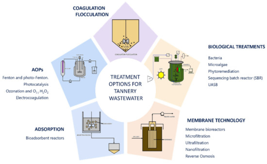 The main technologies for the treatment of tannery wastewater focus only on certain parameters [75], as there is great difficulty in finding a treatment that completely reduces the pollutant load. Figure 2 presents a graphical description of the most common technologies. Since chromium is the main problem in this process, most treatments for these waters focus on the reduction and reuse of this element, followed by treatment for COD, BOD and TDS. These technologies include chemical coagulation processes [76,77] electrocoagulation [78], absorption, advanced oxidation processes [79] and biological processes such as phytoremediation [13,14].