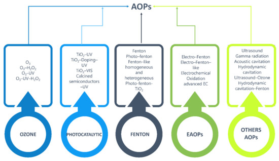 Advanced oxidation processes involve the production and application of highly oxidative radicals, primarily the free hydroxyl radical (OH), capable of selectively degrading recalcitrant contaminants to a less harmful state. Figure 3 represents the most common advanced oxidation processes such as Fenton and photo-Fenton processes, ozone-based processes, photocatalysis, oxidation processes and hydrogen peroxide-UV processes, among other things [8,50,91,92,93,94].
