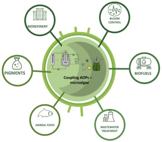 Biotechnological applications of the coupling of microalgae and AOPs.