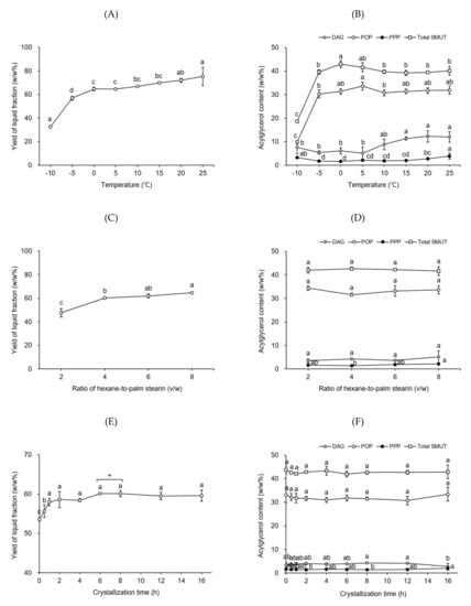Yield of the liquid fraction (A,C,E) and the contents of diacylglycerols (DAGs), tripalmitin (PPP), 1,3-dipalmitoyl-2-oleoyl glycerol (POP), and total symmetric monounsaturated triacylglycerols (SMUTs) in the liquid fraction (B,D,F) obtained from palm stearin during the first hexane fractionation step as a function of temperature, volume-to-weight ratio of hexane-to-palm stearin, and crystallization time, respectively. Fractionation was performed, using 5 g palm stearin in a flat-bottom glass vessel (8 cm × 3.5 cm i.d.). Different letters (a–e) indicate significant differences between samples (p < 0.05). Asterisk (*) denotes significant differences (determined by a two-tailed Student’s t-test) between the two samples (p < 0.05).