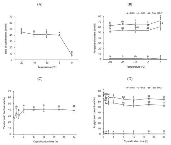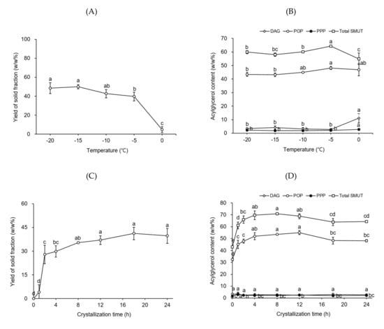 Yield of the solid fraction (A,C) and the contents of diacylglycerols (DAGs), tripalmitin (PPP), 1,3-dipalmitoyl-2-oleoyl glycerol (POP), and total symmetric monounsaturated triacylglycerols (SMUTs) in the solid fraction (B,D) obtained from PS-LF (a liquid fraction prepared by the first fractionation of palm stearin under the best conditions established in this study) during the second hexane fractionation step as a function of temperature and crystallization time, respectively. Fractionation was conducted by using 5 g PS-LF in a flat-bottom glass vessel (8 cm × 3.5 cm i.d.). Different letters (a–e) indicate significant differences between samples (p < 0.05).