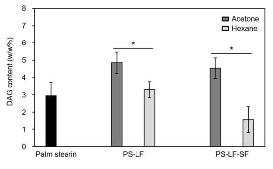 Comparison between the contents of diacylglycerols (DAGs) in fractions obtained by the two-step hexane fractionation of palm stearin and in the counterpart fractions prepared by the two-step acetone fractionation of palm stearin. Hexane fractionation was performed in a flat-bottom glass vessel (11 cm × 10 cm i.d.) under the best conditions established for the small-scale process, using another flat-bottom glass vessel (8 cm × 3.5 cm i.d.). Acetone fractionation was conducted in a flat-bottom glass vessel (11 cm × 10 cm i.d.) under the best conditions reported by Kang et al. [7]. Asterisk (*) indicates significant differences between the two samples (p < 0.05).