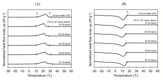 DSC melting (A) and crystallization (B) profiles of PS-LF-SF (POP-rich fats obtained by two-step hexane fractionation of palm stearin under the best conditions established in this study)–shea stearin (SOS-rich fats obtained by hexane fractionation of degummed shea butter under the best conditions optimized herein) blends with different PS-LF-SF:shea stearin weight ratios ranging from 70:30 to 30:70. To and Tc represent the onset and completion temperatures of melting or crystallization, respectively.