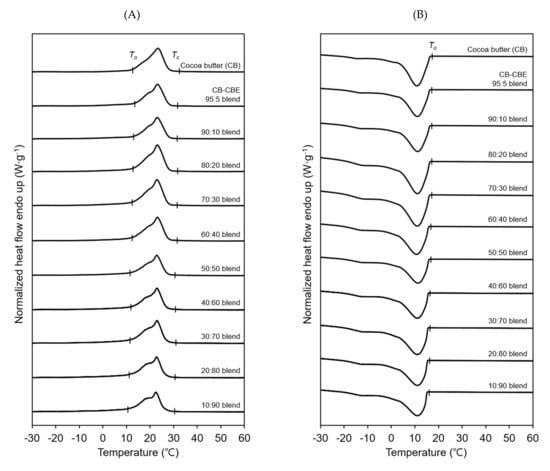 DSC melting (A) and crystallization (B) profiles of cocoa butter and cocoa butter–cocoa butter equivalent (CBE) blends with different cocoa butter:CBE weight ratios ranging from 95:5 to 10:90. To and Tc indicate the onset and completion temperatures of melting or crystallization, respectively.