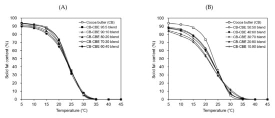 SFC of cocoa butter at different temperatures is a crucial factor determining the physical and textural properties (such as hardness and melting behavior) of chocolate products [8]. The SFCs of cocoa butter and cocoa butter–CBE blends with the cocoa butter:CBE weight ratios ranging from 95:5 to 10:90 were compared as a function of temperature (5–45 °C). Although the SFCs of the cocoa butter–CBE blends were slightly lower than that of cocoa butter below 20 °C, the SFCs of the cocoa butter–CBE blends containing 5–40 w/w% CBEs showed similar changes to that of cocoa butter in the temperature range examined herein (Figure 7A). In other words, the SFCs of the cocoa butter–CBE blends were over 80% at 5–15 °C, thereby indicating the high melting resistance of the blends in this temperature range. Furthermore, the SFCs of the blends sharply decreased at 20–30 °C (suggesting rapid melting of the blends in this temperature range) and finally reached zero at 40 °C (implying complete melting of the blends at this temperature). In contrast, the cocoa butter–CBE blends containing 50–90 w/w% CBEs had different SFC profiles from that of cocoa butter; i.e., the SFCs of the blends were below 80% at 15 °C and relatively gently decreased at 20–30 °C (Figure 7B). These results suggested that the CBEs prepared in this study blended with cocoa butter at levels of up to 40 w/w% without distinctly altering the hardness and melting behavior of cocoa butter.