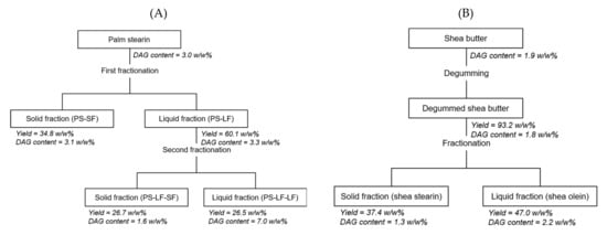 In our previous studies [7,8], we demonstrated that POP-rich fats for CBE formulation can be prepared by two-step acetone fractionation of palm stearin, which is a potential cost-effective material. However, we recently reproduced POP-rich fats from palm stearin under the same fractionation conditions as previously reported [7] and found that the DAG content in these fats ranged from 4 to 5 w/w%, which was higher than that in palm stearin (~3 w/w%). The elevated level of DAGs was attributed to the concentration of DAGs in the liquid phase during the first step of the two-step acetone fractionation.