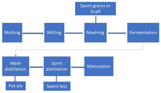 The management of by-products and residues is considered a significant economic and environmental problem in whisky production. The main by-products resulting from the production of malt whisky are spent grain or draff, the starch-depleted waste grains that remain after the mashing stage, pot ale, liquid residues from the first stage of distillation, and the spent yeast resulting from distillation (Figure 1) [10,11].