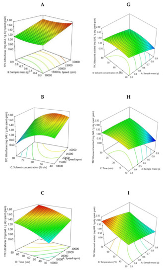 Spent grain subjected to high homogenization released the lowest phenolic content, which was recorded at the correlation of the following parameter values: 0.6 g of sample, 80% solvent concentration, 60 s and 10,000 rpm, and the highest content was observed at the correlation between 0.3 g of sample, 60% solvent concentration, 60 s, and 30,000 rpm. The increase of TPC with stirring rate and time increase showed that a good homogenization helps to release phenolic compounds. Ultra-Turrax pre-treatment by aqueous methanol extraction provides a slightly better yield of phenolic compounds compared to ultrasound-assisted extraction. The origin of the raw material, extraction conditions and previous processing clearly influence the TPC content [37].