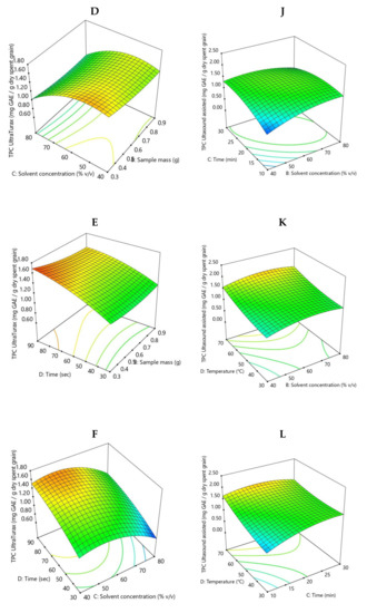 Response surface plots showing the effect of extraction parameters on antioxidant activity for SG Ultra-Turrax pre-treatment (A–F), and for ultrasound-assisted pre-treatment (G–L).