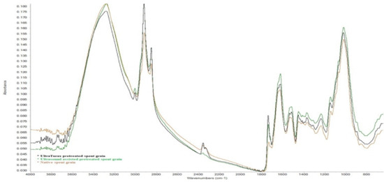 The peaks that were identified in the spectra of the samples in the region of 3000–2850 cm−1 were assigned to symmetric and asymmetric stretching of C-H due to the presence of carbohydrates and lipids. The peak at 3287 cm−1 corresponds to OH stretching and can be attributed to cellulose, and two peaks at 2921 and 2852 cm−1, corresponding to stretching of C=O, respectively, to aliphatic C-H stretch. No triple-bond region was detected in the area 2000–2500 cm−1, resulting in no C≡C bond in spent grain. A broad band between 1730 and 1530 cm−1 includes C=O stretching due to amide I and II, vibrations specific to C-N stretching and N-H deformation (amide II), and C=C stretching in aromatic structures. The aromatic compounds include p-coumaric, ferulic, sinapic, and caffeic acids, which are important phenol compounds. A peak at 1629 cm−1 is associated with the presence of aldehydes, ketones and carboxyl groups (conjugated C=O stretch), and the peak at 1538 cm−1 corresponds to the vibration of C=O, which corresponds to the double-bond region. Several peaks in the fingerprint region are at 1454 cm−1, which represents H-C-H and O-C-H in plane bending vibration, peaks at 1239 and 1025 cm−1 represent C-C, C-OH, C-H ring and side group vibrations, which can be attributed to hemicellulose and lignin [46].