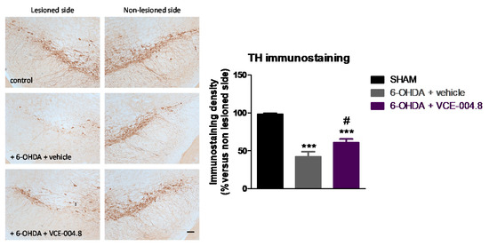 Intensity of the immunostaining for TH measured in a selected area of the substantia nigra pars compacta of control (sham) mice and unilaterally 6-OHDA-lesioned animals treated with VCE-004.8 (20 mg/kg) or vehicle (Maisine CC/corn oil) given orally. Treatments were daily and prolonged for 2 weeks. Data corresponded to percentage of the ipsilateral lesioned side versus contralateral non-lesioned side at 24 h after the last dose and were expressed as means ± SEM of more than 5 animals per group. They were analyzed by one-way ANOVA followed by the Bonferroni test (*** p < 0.005 versus sham; # p < 0.05 versus 6-OHDA + vehicle). Representative immunostaining images for each experimental group are shown in the left panels (scale bar = 100 µm).