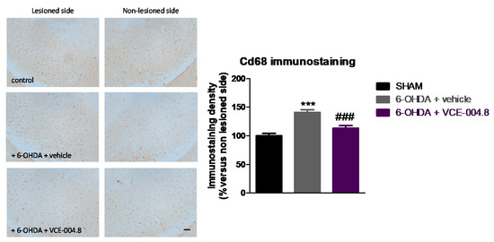 Intensity of the immunostaining for Cd68, a marker of microglia and infiltrated macrophages, measured in a selected area of the substantia nigra pars compacta of control (sham) mice and unilaterally 6-OHDA-lesioned animals treated with VCE-004.8 (20 mg/kg) or vehicle (Maisine CC/corn oil) given orally. Treatments were daily and prolonged for 2 weeks. Data corresponded to percentage of the ipsilateral lesioned side versus contralateral non-lesioned side at 24 h after the last dose and were expressed as means ± SEM of more than 5 animals per group. They were analyzed by one-way ANOVA followed by the Bonferroni test (*** p < 0.005 versus sham; ### p < 0.005 versus 6-OHDA + vehicle). Representative immunostaining images for each experimental group are shown in the left panels (scale bar = 100 µm).