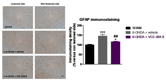 Intensity of the immunostaining for GFAP, a marker of astrocytes, measured in a selected area of the substantia nigra pars compacta of control (sham) mice and unilaterally 6-OHDA-lesioned animals treated with VCE-004.8 (20 mg/kg) or vehicle (Maisine CC/corn oil) given orally. Treatments were daily and prolonged for 2 weeks. Data corresponded to percentage of the ipsilateral lesioned side versus contralateral non-lesioned side at 24 h after the last dose and were expressed as means ± SEM of more than 5 animals per group. They were analyzed by one-way ANOVA followed by the Bonferroni test (* p < 0.05, *** p < 0.005 versus sham; ## p < 0.01 versus 6-OHDA + vehicle). Representative immunostaining images for each experimental group are shown in the left panels (scale bar = 50 µm).