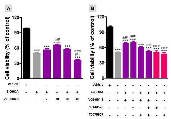 Cell viability measured with the MTT assay in cultured SH-SY5Y cells at 24 h to be treated with: (A): different concentrations of VCE-004.8 (2, 10, 20, and 40 µM) against 6-OHDA (200 µM), and (B): VCE-004.8 (10 µM) against 6-OHDA (200 µM), in the absence or the presence of T0070907 (10 µM), SR144528 (10 µM), or both. In all cases, a group with cells exposed to vehicles was also included to determine the 100% of cell viability. Values are means ± SEM of at least 4 independent experiments each performed in triplicate. Data were assessed by the one-way analysis of variance followed by the Bonferroni test (Both panels: *** p < 0.005 versus control cells; ### p < 0.005 versus cells exposed to 6-OHDA+vehicle; Panel A: @@@ p < 0.005 versus cells treated with the other VCE-004.8 concentrations; Panel B: @@ p < 0.01, @@@ p < 0.005 versus cells treated with VCE-004.8 in absence or presence or SR144528).
