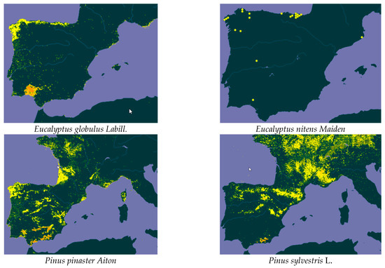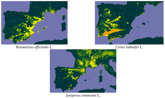 In Spain, according to data from the Spanish Forest Map [13,14], the distribution area of most of the species being studied is considerable. The largest surface area is covered by C. ladanifer (1.7 Mha), followed by P. pinaster (1.35 Mha), R. officinalis (1.3 Mha), P. sylvestris (1.25 Mha), E. globulus (625,000 ha), J. communis (60,000 ha), and finally, E. nitens, with 12,000 ha. The surface area of E. nitens may be larger since it is a species that is commonly used in new wood production plantations in northern Spain.