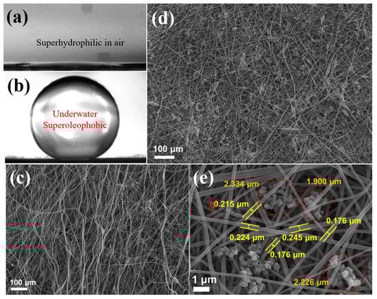 Recently, studies have been focusing on using nanofiber membranes for filtration and separation due to their high porosity and specific surface area [13,14,15,16,17,18]. Several studies have succeeded in the design and development of fibrous biomimetic materials with a superwetting surface [19,20,21]. Nanofiber membranes with hierarchical structure surfaces and high porosity offer numerous advantages, such as great super wettability, ability to separate small oil droplets, and high permeation flux.