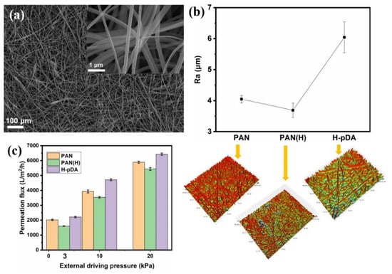 (a) SEM image of the PAN membrane treated with sodium hydroxide solution for 4 h. The inset is a high-magnification SEM image of the fiber surface. (b) Ra values of the membranes (PAN, PAN after hydrolyzation for 4h, and hydrolyzed PAN after 20 h of PDA treatment.). There are noncontact optical profiler imagers, respectively, underneath the graph. (c) Pure-water flux of PAN, PAN-H, and H-PDA at different external driving pressure.