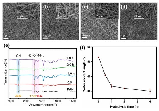 (a–d) SEM images of the hydrolyzed PAN with PDA on the surface after polymerization for different times (1, 4, 8, and 20 h, respectively). (e) FT-IR spectrum of the nanofiber membranes after different hydrolysis times. (f) Water contact angle of the nanofiber membranes prepared at different hydrolysis times.