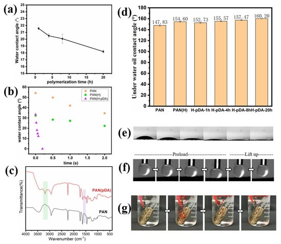 A highly selective wettability for oil and water is a crucial factor for materials used for oil–water separation [35,36]. Thus, the wettability of the fabricated membranes was examined. Although the nitrile group in PAN is hydrophilic, the contact angle measurements indicated that it was still high (53°), which does not meet the requirements for efficient separation. The treatment with NaOH solution (1 mol/L) was conducted to partially hydrolyze the nitrile group in PAN into amide and carboxyl groups. Figure 3e shows the FT-IR spectrum of the PAN-nanofiber membrane treated at different times. The peak at 1732 cm−1 can be attributed to the stretching vibration of the carbonyl group, which proves a successful hydrolysis of APN. Further, the effect of the hydrolysis time was studied. Figure 3f shows the contact angle in the air plotted versus the hydrolysis time. The contact angle was reduced from its initial value of 53° to 30° after 4 h of hydrolysis. After hydrolysis for 2 h, smaller change was observed in the contact angle. After 4 h, a very slight reduction was observed in the contact angle. To further improve the hydrophilicity and underwater oleophobic properties, hydrophilic PDA nanoclusters were polymerized on the surface of PAN (H). The hierarchical rough surface constructed on the membrane further improved the wettability while increasing the underwater oleophobic properties. The abundance of phenolic hydroxyl groups in the PDA further reduced the WCA of the fiber membrane after the PDA treatment. Figure 4a shows the contact angle of PAN (H) membrane in air after dopamine polymerization for different times. Increasing the time to 20 h reduced the contact angle to 18.2°. Moreover, H-PDA exhibited a super wettability. Figure 4b shows the dynamic contact angle process of PAN, PAN (H), and H-PDA, and water droplets were able to rapidly permeate through H-PDA. The WCA reached nearly 0° only 0.25 s after the water droplet contacted the surface of H-PDA, which is a significantly shorter time than those of PAN and PAN (H). The digital photo images of the dynamic contact angle process of H-PDA (Figure 4e) indicate that the entire process took place within 0.25 s.