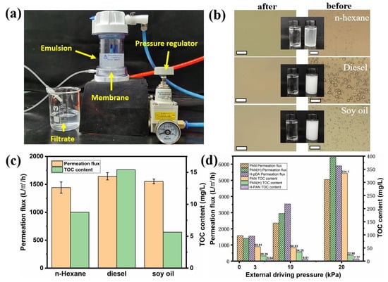 Based on the previous results, the membranes exhibited superhydrophilicity and underwater oleophobicity, and hence, are capable of separating oil–water emulsions. Three types of emulsions were used to evaluate the performance of the membranes: n-hexane, diesel, and soy oil emulsions. Figure 5a shows the process of emulsion separation under an external driving pressure. The membranes were placed into the button of a cell, and then the cell was assembled. The membranes were prewetted, then the emulsions were poured while regulating the driving pressure to the target value. The filtrates were collected to further evaluate the separation performance. The separation under the force of gravity was evaluated by removing the pressure regulator and maintaining a constant height difference between the outlet of the cell and the end of the tube. Here, the height difference was maintained at 30 cm, which equals a driving pressure of approximately 3 kPa. The milky oil–water emulsions became transparent (Figure 5b), and no oil droplets were observed in the filtrates, illustrating that the oil droplets have been successfully removed from the oily wastewater by H-PDA. The permeation fluxes of n-hexane-, diesel-, and soy oil-based emulsions were 1443.6 Lm−2 h−1, 1645.0 Lm−2 h−1, and 1552.9 Lm−2 h−1, respectively (Figure 5c). Table 1 is a comparison of total organic carbon (TOC) content of three emulsions before and after filtration. The separation process was conducted using H-PDA under only the force of gravity. Further comparative experiments revealed that the permeation flux increased with the increase in the driving pressure, but the separation performance was hardly affected. By increasing the driving pressure to 20 kPa, the TOC content of the filtrate separated by PAN membrane sharply increased to 334.1 mg L−1 compared to 55.01 mg L−1 under gravity only (Figure 5d and Table 2), and the separation efficiency decreased from 98% to 91%. On the other hand, H-PDA showed better separation efficiency (up to 99.86% using gravity only). Moreover, by increasing the driving pressure to 20 kPa, the TOC content of the filtrate reached 7.77 mg L−1, which is a slight increase compared to the TOC (5.64 mg L−1) obtained under gravity only, and the separation efficiency remained above 99.8%. In addition, the permeation flux increased from 1552.9 Lm−2 h−1 to 5864.6 Lm−2 h−1, i.e., a 3.8-time increase. These separation fluxes were one order of magnitude higher than those of commercial microfiltration (MF) and ultrafiltration (UF) membranes and were superior to those of previously reported membranes with similar rejection properties and driven external pressures [38,39,40].