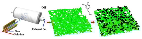 Common nanofiber-fabrication techniques include electrospinning and solution blowing spinning (SBS). SBS has recently been proposed due to its several advantages such as high yield, simplicity, safety, and adaptability in large-scale production. In addition, compared to electrospinning, SBS offers higher efficiency and does not require high voltage, which increases the safety of the process [24,25]. SBS combines the advantages of electrospinning and traditional melt-blown technology [26,27]. Compared to electrospinning fiber membranes, SBS fiber membranes generally show higher porosity [26,28]. This method involves two parallel concentric fluid streams, a polymer solution, and a gas flow around the solution [29]. Polydopamine (PDA) is a well-known bio-inspired polymer. It can be easily deposited on the surface of various organic or inorganic materials and has good stability. Its abundant hydrophilic groups provide super-hydrophilic properties [30].